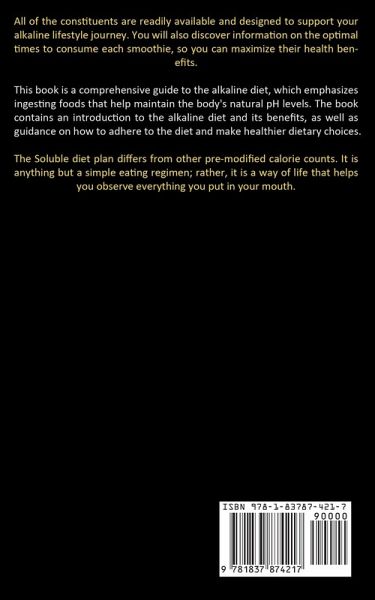 All of the constituents are readily available and designed to support your alkaline lifestyle journey. You will also discover information on the optimal times to consume each smoothie, so you can maximize their health benefits. This book is a comprehensive guide to the alkaline diet, which emphasizes ingesting foods that help maintain the body's natural pH levels. The book contains an introduction to the alkaline diet and its benefits, as well as guidance on how to adhere to the diet and make healthier dietary choices. The Soluble diet plan differs from other pre-modified calorie counts. It is anything but a simple eating regimen; rather, it is a way of life that helps you observe everything you put in your mouth.
