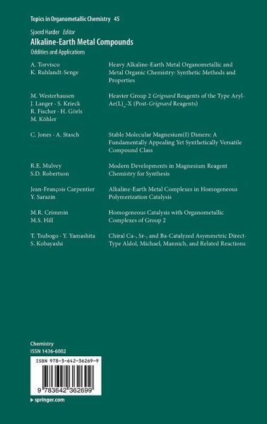 Ana Torvisco, Karin Ruhlandt-Senge: Heavy Alkaline-Earth Metal Organometallic and Metal Organic Chemistry: Synthetic Methods and Properties.- Matthias Westerhausen, Jens Langer, Sven Krieck, Reinald Fischer, Helmar Görls, Mathias Köhler: Heavier Group 2 Grignard Reagents of the Type Aryl-Ae(L) n -X (Post-Grignard Reagents.- Cameron Jones, Andreas Stasch: Stable Molecular Magnesium(I) Dimers: A Fundamentally Appealing yet Synthetically Versatile Compound Class.- Robert E. Mulvey, Stuart D. Robertson: Modern Developments in Magnesium Reagent Chemistry for Synthesis.- Jean-François Carpentier, Yann Sarazin: Alkaline-Earth Metal Complexes in Homogeneous Polymerization Catalysis.- Mark R. Crimmin, Michael S. Hill: Homogeneous Catalysis with Organometallic Complexes of Group 2.- Tetsu Tsubogo, Yasuhiro Yamashita, Shu Kobayashi: Chiral Ca, Sr and Ba-catalyzed asymmetric direct-type aldol, Michael, and Mannich and related reactions.