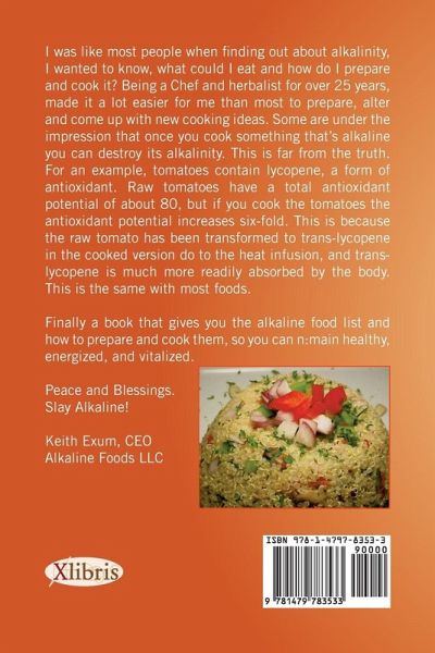 I was like most people when finding out about alkalinity, I want to know, what can I eat and how do I prepare and cook it? Being a Chef and herbalist for over 25 years, made it a lot easier for me than most to prepare, alter and come up with new cooking ideas. Some are under the impression that once you cook something that's alkaline you can destroy its alkalinity. This is further than the truth. For an example, tomatoes contain lycopene, a form of antioxidant. Raw tomatoes have a total antioxidant potential of about 80, but if you cook the tomatoes the antioxidant potential goes up to about six-fold. This is because the raw tomato has been transformed to trans-lycopene in the cooked version do to the heat infusion, and trans-lycopene is much more readily absorbed by the body. This is the same with most foods. Finally a book that gives you the alkaline food list and how to prepare and cook them, so you can remain healthy, energized, and vitalized.