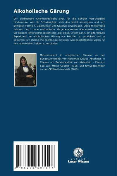 Der traditionelle Chemieunterricht birgt für die Schüler verschiedene Hindernisse, wie die Schwierigkeit, sich den Inhalt anzueignen und sich Symbole, Formeln, Gleichungen und Gesetze einzuprägen. Diese Hindernisse müssen durch neue methodische Vorgehensweisen überwunden werden. Vor diesem Hintergrund besteht das Ziel dieser Arbeit darin, ein alternatives Experiment zur alkoholischen Gärung von Früchten zu entwickeln und zu bewerten, um chemische Kenntnisse mit einer wissenschaftlichen Vision für den industriellen Sektor zu verbinden.