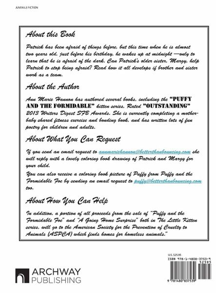 Patrick has been afraid of things before, but this time when he is almost two years old, just before his birthday, he wakes up at midnight -only to learn that he is afraid of the dark. Can Patrick's older sister, Margy, help Patrick to stop being afraid? Read how it all develops if brother and sister work as a team.
