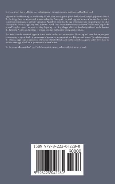 Everyone knows that of all foods - not excluding meat - the egg is the most nutritious and healthiest food. Eggs that are used for eating are produced by the hen, duck, turkey, goose, guinea fowl, peacock, seagull, pigeon and ostrich. The hen's egg, however, surpasses all in taste and quality. Some prefer the duck egg, not because of its taste, but because it contains more nitrogenous and fatty substances. Apart from their size, the eggs of the turkey and the gosling have no other characteristic. The quail egg is very small, but with a superb taste. So dear to the eccentric desires of Vitellius and Caligula, the peacock's egg has a sweet, sometimes terribly disgusting taste. Seagull eggs, which are abundantly collected on the shores of the Baltic and North Seas, have their convinced fans, despite the rather strong smell of fish oil. The Arabs consider an ostrich egg soon buried in the sand to be a pleasant feast. Not so big and more delicate, the green cassowary egg is a great food - it has the taste of a goose egg accompanied by a delicate exotic aroma. The delicious taste of the pheasant egg is vaguely reminiscent of the meat of the bird itself. And on the coast of Madagascar and in Tibet there is a trade in turtle eggs, which are in great demand by the Chinese. Yet the crown falls on the hen's egg. Firstly, because it is cheaper and secondly, it is always at hand.