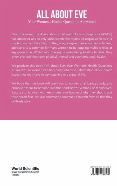 Over the years, the Association of Women Doctors Singapore (AWDS) has observed and keenly understands the myriad of responsibilities of a modern woman. Daughter, mother, wife, caregiver, career woman, volunteer, advocate; it is common for many women to be juggling multiple roles at any given time. While being the key in maintaining healthy families, they often overlook their own physical, mental and even emotional health. We produce this book "All about Eve: Your Women's Health Questions Answered" so women can find comprehensive information about health issues they may have to navigate in every stage of life. We hope that this book will reach out to women of all backgrounds, and empower them to become healthier and better versions of themselves. Because only when women understand how and why they should put their needs first, can our community continue to benefit from all that they selflessly give.