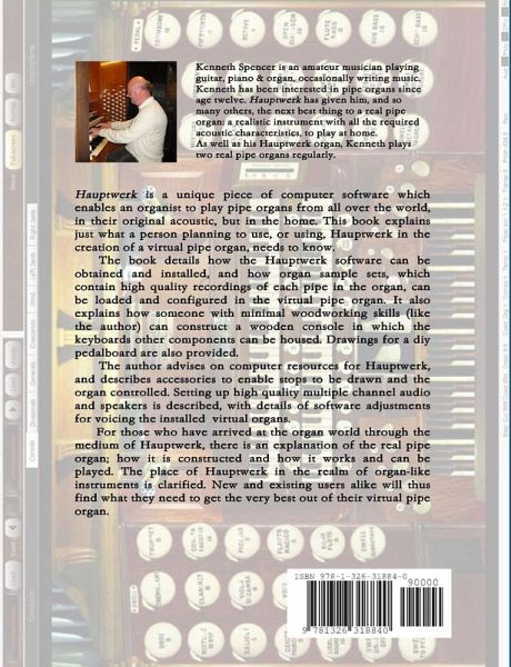 This book explains just what a person planning to use Hauptwerk in the creation of a virtual pipe organ needs to know. Hauptwerk is a unique piece of computer software which enables an organist to play pipe organs from all over the world, in their original acoustic, but in the home. The book details how the Hauptwerk software can be obtained and installed, and how organ sample sets can be loaded and configured in the virtual organ. It also explains how someone with minimal woodworking skills can construct a wooden console in which the keyboards other components can be housed. Drawing for a diy pedalboard are also provided. The author advises on computer resources for Hauptwerk, and describes accessories to enable stops to be drawn the organ controlled. Setting up high quality multiple channel audio and speakers is described, with details of software adjustments for voicing virtual organs. New and existing users will find what they need to get the very best out of their virtual pipe organ.