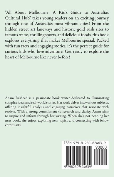 "All About Melbourne: A Kid's Guide to Australia's Cultural Hub" takes young readers on an exciting journey through one of Australia's most vibrant cities! From the hidden street art laneways and historic gold rush sites to famous trams, thrilling sports, and delicious foods, this book explores everything that makes Melbourne special. Packed with fun facts and engaging stories, it's the perfect guide for curious kids who love adventure. Get ready to explore the heart of Melbourne like never before!