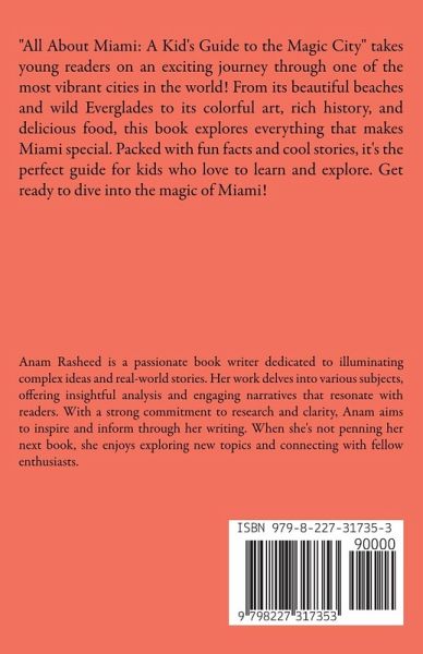 "All About Miami: A Kid's Guide to the Magic City" takes young readers on an exciting journey through one of the most vibrant cities in the world! From its beautiful beaches and wild Everglades to its colorful art, rich history, and delicious food, this book explores everything that makes Miami special. Packed with fun facts and cool stories, it's the perfect guide for kids who love to learn and explore. Get ready to dive into the magic of Miami!