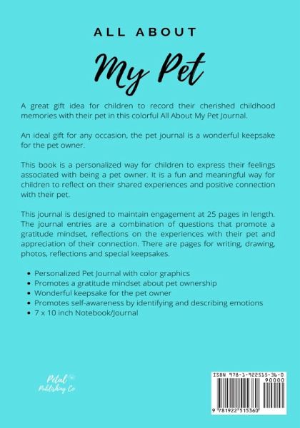 A great gift idea for children to record their cherished childhood memories with their Pet in this colorful About My Pet Journal.A wonderful keepsake for Pet owners. Ideal Birthday, Christmas gift or fun activity gift. This book is a personalised way for children to express their feelings associated with being a Pet owner. It is a fun and meaningful way for children to reflect on their shared experiences and positive connection with their Pet. This Journal is designed to maintain engagement at 25 pages in length. The Journal entries are a combination of questions that promote a gratitude mindset, reflections on their experiences with their Pet and appreciation of their connection. There are pages for writing, drawing, photos, reflections and special keepsakes. - Personalised Pet Journal with color graphics - Promotes a gratitude mindset about Pet ownership - Wonderful keepsake for the Pet Owner - Promotes self- awareness by identifying and describing emotions. - 6.69 x 9.61 inch Notebook/Journal.