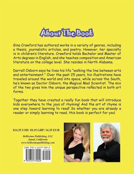 Gina Crawford has authored works in a variety of genres, including a thesis, journalistic articles, and poetry. However, her specialty is in children's literature. Crawford holds Bachelor and Master of Arts degrees in English and teaches composition and American literature on the college level. She resides in North Alabama. Darrell Osborn says he lives his life "walking the line between arts and entertainment." Over the past 25 years, his illustrations have traveled around the world and into space. While across the South, he's known as Doctor Osborn, the Magical Mad Scientist. The mixing of the two gives him the unique perspective reflected in both art forms. Together they have created a really fun book that will introduce kids everywhere to the joys of rhyming! And the art of rhyme is one step toward learning to read! So whether you are already reading, or simply learning to read, this book is perfect for you! There is also a free music video on the Bellissimavideo YouTube channel that goes with this book for even more learning fun!