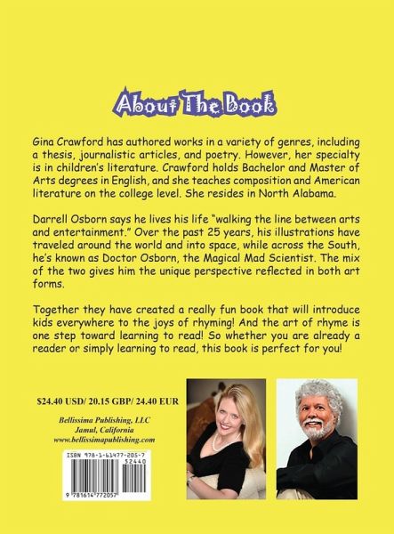 Gina Crawford has authored works in a variety of genres, including a thesis, journalistic articles, and poetry. However, her specialty is in children's literature. Crawford holds Bachelor and Master of Arts degrees in English, and she teaches composition and American literature on the college level. She resides in North Alabama. Darrell Osborn says he lives his life "walking the line between arts and entertainment." Over the past 25 years, his illustrations have traveled around the world and into space, while across the South, he's known as Doctor Osborn, the Magical Mad Scientist. The mix of the two gives him the unique perspective reflected in both art forms. Together they have created a really fun book that will introduce kids everywhere to the joys of rhyming! And the art of rhyme is one step toward learning to read! So whether you are already a reader or simply learning to read, this book is perfect for you! There is also a free music video on the Bellissimavideo YouTube channel that goes with this book for even more learning fun!