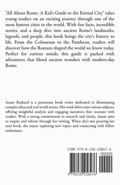 "All About Rome: A Kid's Guide to the Eternal City" takes young readers on an exciting journey through one of the most famous cities in the world. With fun facts, incredible stories, and a deep dive into ancient Rome's landmarks, legends, and people, this book brings the city's history to life. From the Colosseum to the Pantheon, readers will discover how the Romans shaped the world we know today. Perfect for curious minds, this guide is packed with adventures that blend ancient wonders with modern-day Rome.