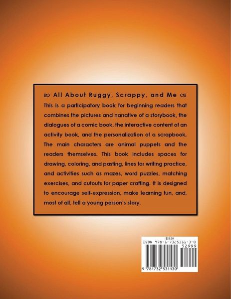 All About Ruggy, Scrappy, and Me is a participatory book for beginning readers, especially those at a second-grade reading level. It can also be helpful for older children learning English as a non-native language. It is unique in that it combines the pictures and narrative of a storybook, the dialogues of a comic book, the interactive content of an activity book, and the personalization of a scrapbook. The main characters are animal puppets and the readers themselves. The activities include cutouts for paper crafting, drawings for coloring, lines for writing practice, mazes, word puzzles, and more! The book is designed to encourage self-expression, make learning fun, and, most of all, tell a young person's story.