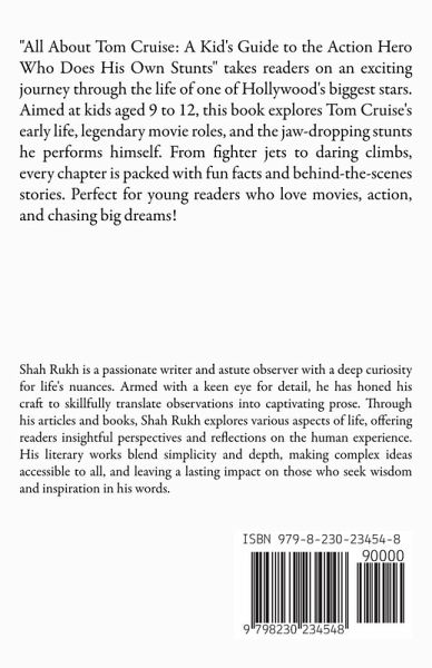 "All About Tom Cruise: A Kid's Guide to the Action Hero Who Does His Own Stunts" takes readers on an exciting journey through the life of one of Hollywood's biggest stars. Aimed at kids aged 9 to 12, this book explores Tom Cruise's early life, legendary movie roles, and the jaw-dropping stunts he performs himself. From fighter jets to daring climbs, every chapter is packed with fun facts and behind-the-scenes stories. Perfect for young readers who love movies, action, and chasing big dreams!