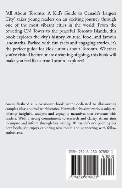 "All About Toronto: A Kid's Guide to Canada's Largest City" takes young readers on an exciting journey through one of the most vibrant cities in the world! From the towering CN Tower to the peaceful Toronto Islands, this book explores the city's history, culture, food, and famous landmarks. Packed with fun facts and engaging stories, it's the perfect guide for kids curious about Toronto. Whether you've visited before or are dreaming of going, this book will make you feel like a true Toronto explorer!