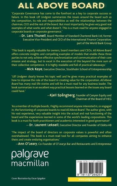 'Corporate Governance has come to the forefront as a key to corporate success or failure. In this book Ulf Lindgren summarizes the issues around the board such as the composition, its role and responsibilities as well the relationships between the chairman, CEO and the rest of the board. But most importantly he gives very good real examples of what works and what doesn't. This is a must read for anyone engaged in corporate boards or corporate governance.' - Dr. Lars Thunell, Board member of Standard Chartered Bank ltd. Former Executive Vice President and CEO of the International Finance Corporation, part of the World Bank Group 'This book is equally valuable for Owners, Board Members and CEOs. All Above Board offers concrete insights and compelling examples of models that enable these three parties to not only achieve effective synchronization and communication of their core mission and strategy, but to excel in the execution of this beyond the mere sum of their collective competence. It is highly readable and full of practical takeaways.' - Nick Kaye, Executive Director, Stockholm School of Entrepreneurship 'Ulf Lindgren clearly knows his topic well and he gives many practical examples how to improve the role of the board in creating value for the corporation. All Above the Board has many real life stories and will be a must read for any business leader. The book summarizes in an excellent way practical lessons learned on the issues any board could have.' - Kjell Spångberg, Founder of Canyon Equity and chairman of the board of HEG 'As a member of multiple Boards I highly recommend anyone interested in, or, engaged in the functioning of corporate Boards to read All Above Board. The author gives, with his vast experience, very valuable insight into the actual and real functioning of the Board and the experiences learned in some of the world's leading corporations. This book is a must for both practitioners and academics interested in good governance!' - Dr. Laurent Leksell, Executive Director and Founder of Elekta AB 'The impact of the Board of Directors on corporate values is powerful and often overshadowed. This book is a must-read tool for all companies aiming to enhance theirs and create enduring organisations.' - Ann O'Leary, Co-founder of O'Learys Bar and Restaurants and Entrepreneur…mehr