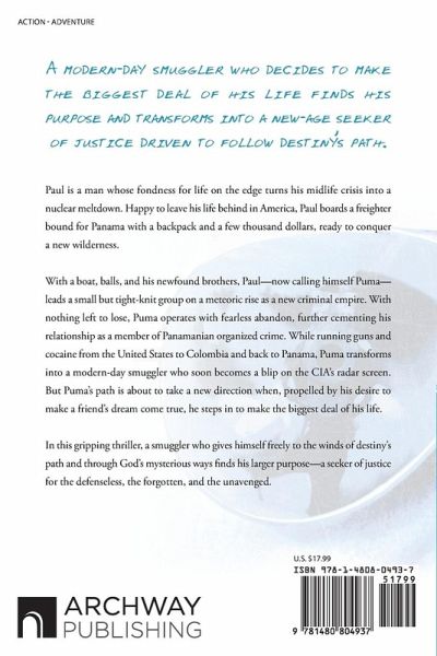 Paul is a man whose fondness for life on the edge turns his midlife crisis into a nuclear meltdown. Happy to leave his life behind in America, Paul boards a freighter bound for Panama with a backpack and a few thousand dollars, ready to conquer a new wilderness. With a boat, balls, and his newfound brothers, Paul-now calling himself Puma-leads a small but tight-knit group on a meteoric rise as a new criminal empire. With nothing left to lose, Puma operates with fearless abandon, further cementing his relationship as a member of Panamanian organized crime. While running guns and cocaine from the United States to Colombia and back to Panama, Puma transforms into a modern-day smuggler who soon becomes a blip on the CIA's radar screen. But Puma's path is about to take a new direction when, propelled by his desire to make a friend's dream come true, he steps in to make the biggest deal of his life. In this gripping thriller, a smuggler who gives himself freely to the winds of destiny's path and through God's mysterious ways finds his larger purpose-a seeker of justice for the defenseless, the forgotten, and the unavenged.