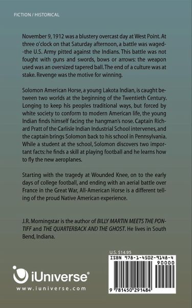 November 9, 1912 was a blustery overcast day at West Point. At three o'clock on that Saturday afternoon, a battle was waged--the U.S. Army versus the Indians. This battle was not fought with guns and swords, bows or arrows: the weapon used was an oversized tapered ball. The end of a culture was at stake. Revenge was the motive for winning. Solomon American Horse, a young Lakota Indian, is caught between two worlds at the beginning of the Twentieth Century. Longing to keep his peoples traditional ways, but forced by white society to conform to modern American life, the young Indian finds himself facing the hangman's nose. Captain Richard Pratt of the Carlisle Indian Industrial School intervenes, and the captain brings Solomon back to his school. In Pennsylvania, Solomon discovers two importan facts: he finds a skill at playing football and he learns how to fly the new aeroplanes. Starting with the tragedy at Wounded Knee, on to the early days of college football, and ending with an aerial battle over France in the Great War, All-American Horse is a different telling of the proud Native American experience.