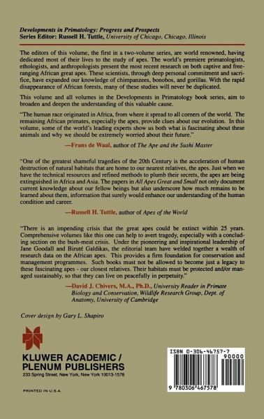 Many of the papers in this volume were first presented at the Third International Great Apes of the World Conference, held July 3-6, 1998 in Kuching, Sarawak, Malaysia. The editors of this volume, the first in a two-volume series, are world renowned, having dedicated most of their lives to the study of great apes. The world's premiere primatologists, ethologists, and anthropologists present the most recent research on both captive and free-ranging African great apes. These scientists, through deep personal commitment and sacrifice, have expanded their knowledge of chimpanzees, bonobos, and gorillas. With forests disappearing, many of these studies will never be duplicated. This volume, and all in the Developments in Primatology book series, aim to broaden and deepen the understanding of this valuable cause.