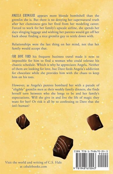 Angela Grimalke appears more blonde bombshell than the gremlin she is. But there is no denying her supernatural truth after her clumsiness gets her fired from her modeling career. Forced to work for her family's upscale airline, she spends her days slinging luggage and wishing her parents would get off her back about finding a nice gremlin guy to settle down with. Relationships were the last thing on her mind, not that her family would accept that. For Dave Ford his frequent business travel made it next to impossible for him to find a woman who could tolerate his chaotic schedule. Which is why he appreciates Angela. Neither of them are looking for love, but Dave feeds Angela's addiction for chocolate while she provides him with the chaos to keep him on his toes. However, as Angela's parents bombard her with a parade of "eligible" gremlin men at their weekly family dinners, she finds herself torn between who she longs to be and her family's expectations. Will she give in and live the life of magic they want for her? Or risk it all by to confessing to Dave that she isn't human?