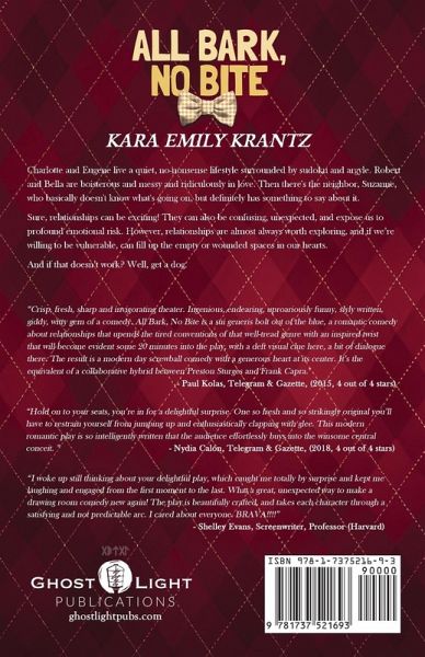 A comedy stage play by Kara Emily Krantz. Charlotte and Eugene live a quiet, no-nonsense lifestyle surrounded by sudoku and argyle. Robert and Bella are boisterous and messy and ridiculously in love. Then there's the neighbor, Suzanne, who basically doesn't know what's going on, but definitely has something to say about it. Sure, relationships can be exciting! They can also be confusing, unexpected, and expose us to profound emotional risk. However, relationships are almost always worth exploring, and if we're willing to be vulnerable, can fill up the empty or wounded spaces in our hearts. And if that doesn't work? Well, get a dog.…mehr