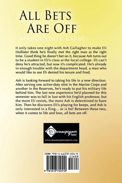 It only takes one night with Ash Gallagher to make Eli Hollister think he's finally met the right man at the right time. Good thing he doesn't bet on it, because Ash turns out to be a student in Eli's class at the local college. Eli can't deny he's attracted, but now it's complicated. He's already in enough trouble with the department head, a man who would like to see Eli denied his tenure and fired. Ash is looking forward to taking his life in a new direction. After serving one active-duty stint in the Marine Corps and another in the Reserves, he's ready to put his military life behind him. The last new experience he'd planned for this semester was to fall in lust with his English professor, but the more Eli resists, the more Ash is determined to have him. Then he discovers Eli's playing for keeps, and Ash is only interested in a fling... or is he? Between these two, when it comes to life and love, all bets are off.
