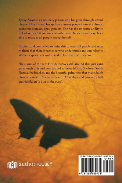 Lynne Kason is an ordinary person who has gone through several phases of her life and has spoken to many people from all cultures, economic statuses, ages, genders. She has the uncanny ability to feel what they feel and understands them. She seems to always been able to relate to all people, except herself. Inspired and compelled to write this to reach all people and relay to them that there is someone who understands and can relate to all their experiences and to make clear that there is a God. She is one of the rare Florida natives still around that just can't get enough of it and now too old to move North. She loves South Florida, the beaches, and the beautiful palm trees that make South Florida beautiful. She has a beautiful daughter and two and a half grandchildren (a bun in the oven).