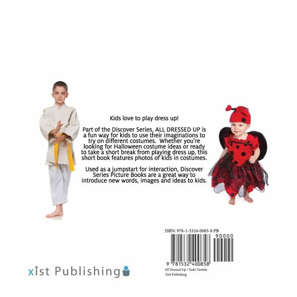 Discover Series Books for Babies & Toddlers Kids love to play dress up! Part of the Discover Series, ALL DRESSED UP is a fun way for kids to use their imaginations to try on different costumes. Whether you're looking for Halloween costume ideas or ready to take a short break from playing dress up, this short book features photos of kids in costumes. Used as a jumpstart for interaction, Discover Series Picture Books are a great way to introduce new words, images and ideas to kids. Descubra libros de la serie para bebés y niños ¡Los niños les encanta jugar a vestirse! Parte de la serie Discover, ALL DRESSED UP es una forma divertida para que los niños usen su imaginación para probar diferentes trajes. Si usted está buscando ideas del traje de Halloween o listo tomar una rotura corta de jugar el vestido para arriba, este libro corto ofrece las fotos de los cabritos en trajes. Utilizado como un jumpstart para la interacción, Discover Series Picture Books son una gran manera de introducir nuevas palabras, imágenes e ideas a los niños. Discover series bilingual titles feature word picture association in both English and Spanish.