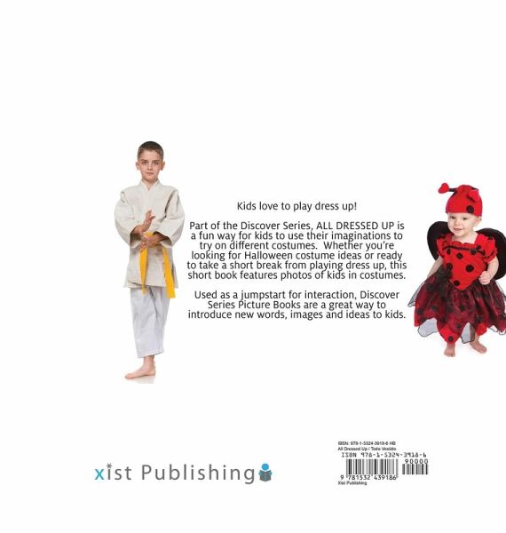 Discover Series Books for Babies & Toddlers Kids love to play dress up! Part of the Discover Series, ALL DRESSED UP is a fun way for kids to use their imaginations to try on different costumes. Whether you're looking for Halloween costume ideas or ready to take a short break from playing dress up, this short book features photos of kids in costumes. Used as a jumpstart for interaction, Discover Series Picture Books are a great way to introduce new words, images and ideas to kids. Descubra libros de la serie para bebés y niños ¡Los niños les encanta jugar a vestirse! Parte de la serie Discover, ALL DRESSED UP es una forma divertida para que los niños usen su imaginación para probar diferentes trajes. Si usted está buscando ideas del traje de Halloween o listo tomar una rotura corta de jugar el vestido para arriba, este libro corto ofrece las fotos de los cabritos en trajes. Utilizado como un jumpstart para la interacción, Discover Series Picture Books son una gran manera de introducir nuevas palabras, imágenes e ideas a los niños. Discover series bilingual titles feature word picture association in both English and Spanish.