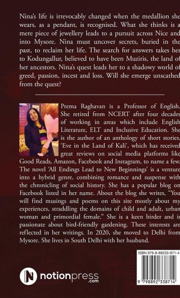 Nina's life is irrevocably changed when the medallion she wears, as a pendant, is recognised. What she thinks is a mere piece of jewellery leads to a pursuit across Nice and into Mysore. Nina must uncover secrets, buried in the past, to reclaim her life. The search for answers takes her to Kodungallur, believed to have been Muziris, the land of her ancestors. Nina's quest leads her to a shadowy world of greed, passion, incest and loss. Will she emerge unscathed from the quest?
