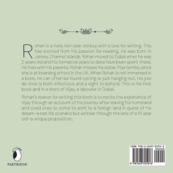 Rohan's reason for writing this book is to recite the experience of Vijay through an account of his journey after leaving his homeland and loved ones to come to work to a foreign land in quest of his dream-a real life scenario but written through the lens of a 10 year old-a unique proposition.