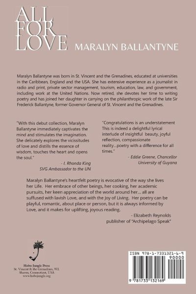 All For Love is a book of poetry by a retired lawyer/journalist from St. Vincent and the Grenadines in the Carribbean. In All for Love, the author seeks to awaken readers to the essential role love plays in human life, be it love of country, love of the environment, love of neighbor, love of foreigner, love of self, love of animal, love of deity, love of creator.