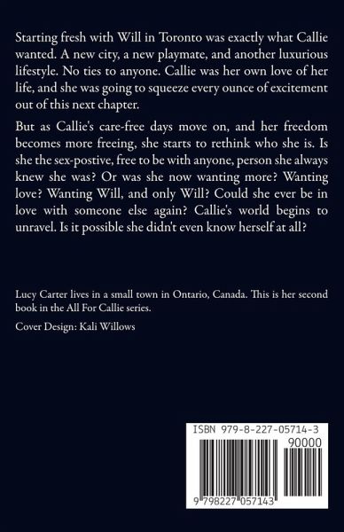 Starting fresh with Will in Toronto was exactly what Callie wanted. She had no cares in the world. A new city, a new playmate, and another luxurious home and lifestyle. No ties to anyone. Callie was her own love of her life, and she was going to squeeze every ounce of excitement out of this next chapter. But as Callie's care-free days move on, and her freedom becomes more freeing, she starts to rethink who she is. Is she the sex-postive, free to be with anyone, person she always knew she was? Or was she now wanting more? Wanting love? Wanting Will, and only Will? Could she even do a relationship? More so, could she ever be in love with someone else again? Callie's world begins to unravel. Is it possible she didn't even know herself at all? Lucy Carter lives in a small town in Ontario, Canada. This is her debut romance novel. Cover Design: Kali Willows