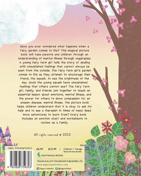 Have you ever wondered what happens when a fairy garden comes to life? This magical picture book will take parents and children through an understanding of mental illness through vegetables. A young fairy farm girl tells the story of dealing with unexplained feelings that cannot always be seen from the outside. The fairy farm girl's garden comes to life as they attempt to encourage their friend, the squash, to see the brightness of the day. Could the young squash have unexplained feelings that others cannot see? The fairy farm girl, family, and friends join together to teach an essential lesson about emotions, mental illness, and the power for others to show compassion for an unseen disease; mental illness. The picture book helps children understand that it is okay to ask for help and to see a therapist in times of need. Need more adventures to learn from? Every book includes an emotion chart and worksheets to review as a family.
