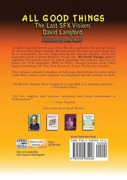 A highly regarded writer and critic, David Langford (who describes himself as "notoriously deaf yet mysteriously able to detect the quietest offer of a drink") is the proud winner of twenty-nine Hugo Awards. Renowned for his keen eye and sharp wit, he is responsible for the long-running fan journal Ansible, which has been described as genre fiction’s Private Eye. All Good Things gathers together 100 articles, most of which represent the author’s final run of pieces for SFX magazine (2009 to 2016), though articles from other venues including The New York Review of Science Fiction also feature. This volume contains a number of illustrations by cover artist Andy Watt, whose work regularly accompanied David’s articles in SFX. The hardback includes 14 full page colour prints of Andy's work, the paperback 12 black and white images. "In British fandom Dave Langford is regarded as a national treasure." – Christopher Priest. "[A] wit, slightly deaf person, raconteur and finest swordsman in Christendom." – Terry Pratchett.