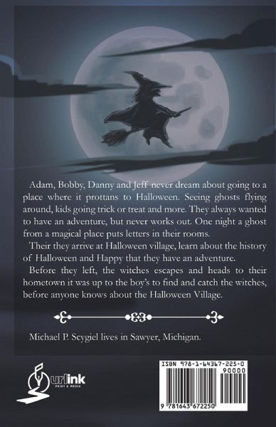 Adam, Bobby, Danny and Jeff never dream about going to a place where it prottans to Halloween. Seeing ghosts flyting around, kids going trick or treat and more. They always wanted to have an adventure, but never works out. One night a ghost from a magical place puts letters in their rooms. Their they arrive at Halloween village, learn about the history of Halloween and Happy that they have an adventure. Before they left, the witches escapes and heads to their hometown it was up to the boy's to find and catch the witches, before anyone knows about the village of Halloween. Michael P. Scygiel lives in Sawyer, Michigan.