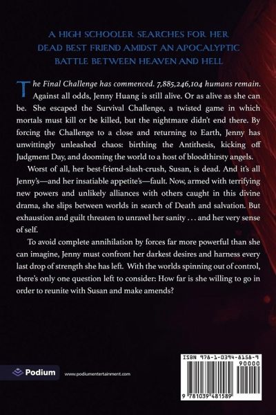 A high schooler searches for her dead best friend amidst an apocalyptic battle between heaven and hell in the second book of this horror LitRPG series. The Final Challenge has commenced. 7,885,246,104 humans remain. Against all odds, Jenny Huang is still alive. Or as alive as she can be. She escaped the Survival Challenge, a twisted game in which mortals must kill or be killed, but the nightmare didn't end there. By forcing the Challenge to a close and returning to Earth, Jenny has unwittingly unleashed chaos: birthing the Antithesis, kicking off Judgment Day, and dooming the world to a host of bloodthirsty angels. Worst of all, her best-friend-slash-crush, Susan, is dead. And it's all Jenny's-and her insatiable appetite's-fault. Now, armed with terrifying new powers and unlikely alliances with others caught in this divine drama, she slips between worlds in search of Death and salvation. But exhaustion and guilt threaten to unravel her sanity . . . and her very sense of self. To avoid complete annihilation by forces far more powerful than she can imagine, Jenny must confront her darkest desires and harness every last drop of strength she has left. With the worlds spinning out of control, there's only one question left to consider: How far is she willing to go in order to reunite with Susan and make amends? The second volume of the hit LitRPG fantasy series-with more than 400,000 views on Royal Road-now available in paperback, ebook, and audiobook!