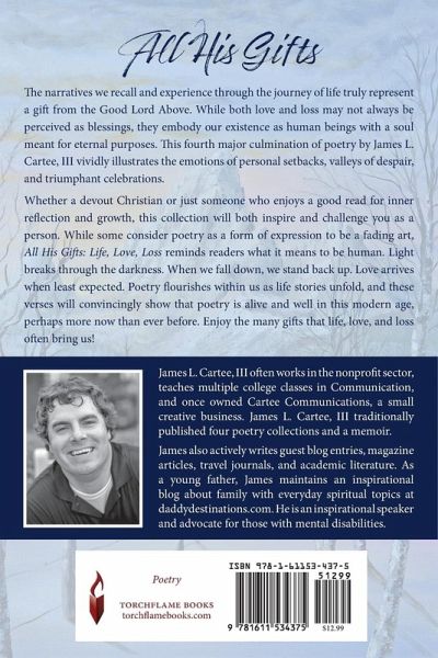 The narratives we recall and experience through the journey of life truly represent a gift from the Good Lord Above. While both love and loss may not always be perceived as blessings, they embody our existence as human beings with a soul meant for eternal purposes. This fourth major culmination of poetry by James L. Cartee, III vividly illustrates the emotions of personal setbacks, valleys of despair, and triumphant celebrations. Whether a devout Christian or just someone who enjoys a good read for inner reflection and growth, this collection will both inspire and challenge you as a person. While some consider poetry as a form of expression to be a fading art, All His Gifts: Life, Love, Loss reminds readers what it means to be human. Light breaks through the darkness. When we fall down, we stand back up. Love arrives when least expected. Poetry flourishes within us as life stories unfold, and these verses will convincingly show that poetry is alive and well in this modern age, perhaps more now than ever before. Enjoy the many gifts that life, love, and loss often bring us!