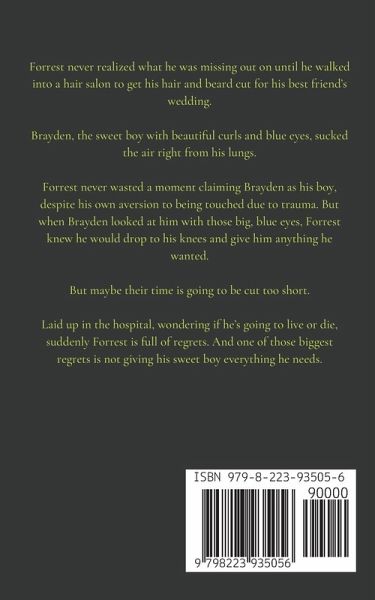 Standalone DDlb Romance Forrest never realized what he was missing out on until he walked into a hair salon to get his hair and beard cut for his best friend's wedding. Brayden, the sweet boy with beautiful curls and blue eyes, sucked the air right from his lungs. Forrest never wasted a moment claiming Brayden as his boy, despite his own aversion to being touched due to trauma. But when Brayden looked at him with those big, blue eyes, Forrest knew he would drop to his knees and give him anything he wanted. But maybe their time is going to be cut too short. Laid up in the hospital, wondering if he's going to live or die, suddenly Forrest is full of regrets. And one of those biggest regrets is not giving his sweet boy everything he needs.