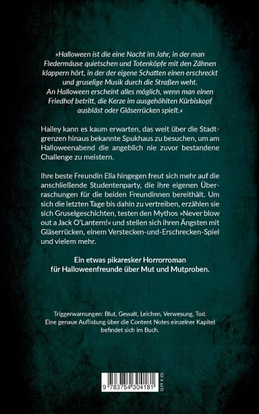 »Halloween ist die eine Nacht im Jahr, in der man Fledermäuse quietschen und Totenköpfe mit den Zähnen klappern hört, in der der eigene Schatten einen erschreckt und gruselige Musik durch die Straßen weht.An Halloween erscheint alles möglich, wenn man einen Friedhof betritt, die Kerze im ausgehöhlten Kürbiskopf ausbläst oder Gläserrücken spielt.«Hailey kann es kaum erwarten, das weit über die Stadtgrenzen hinaus bekannte Spukhaus zu besuchen, um am Halloweenabend die angeblich nie zuvor bestandene Challenge zu meistern.Ihre beste Freundin Ella hingegen freut sich mehr auf die anschließende Studentenparty, die ihre eigenen Überraschungen für die beiden Freundinnen bereithält. Um sich die letzten Tage bis dahin zu vertreiben, erzählen sie sich Gruselgeschichten, testen den Mythos »ever blow out a Jack O'Lantern!« und stellen sich ihren Ängsten mit Gläserrücken, einem Verstecken-und-Erschrecken-Spiel und vielem mehr.Ein etwas pikaresker Horrorroman für Halloweenfreunde über Mut und Mutproben.Triggerwarnungen: Blut, Gewalt, Leichen, Verwesung, Tod.Eine genaue Auflistung über die Content Notes einzelner Kapitel befindet sich im Buch.