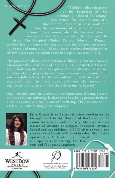 "I didn't believe in prayer at the beginning of that summer, I believed in action," Julie writes. This was the start of a three-month experiment that took her from the boardrooms of corporate America to various hospital rooms, where she discovered how to minister to the families of patients, the sick, and the dying. The Hospital Clinical Pastoral Education Program enabled her to create a learning contract that focused on prayer. Julie recorded numerous vivid and sometimes heartbreaking stories of how prayer can transform those in its path, especially Julie. Her prayers are direct and sometimes challenging, but an answer is always provided, and most of the time, it is unexpected. Have an inside look into the life of a chaplain, and see what it's like when a surgeon asks for prayers in an emergency room trauma unit. Find out how Julie talks with a five-year-old who just discovered she is paralyzed from the neck down and how she answers an eight-year-old's question, "Are there dinosaurs in heaven?" Each patient's story helps develop the importance of being present to those who are suffering. It also shows how being present in these situations can also bring up our own suffering. The one constant in each story is the healing power of prayer.
