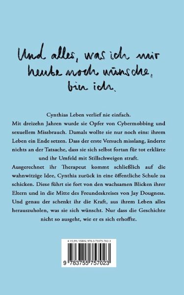 Cynthias Leben verlief nie einfach.Mit dreizehn Jahren wurde sie Opfer von Cybermobbing und sexuellem Missbrauch. Damals wollte sie nur noch eins: ihrem Leben ein Ende setzen. Dass der erste Versuch misslang, änderte nichts an der Tatsache, dass sie sich selbst fortan für tot erklärte und ihr Umfeld mit Stillschweigen straft.Ausgerechnet ihr Therapeut kommt schließlich auf die wahnwitzige Idee, Cynthia zurück an eine öffentliche Schule zu schicken. Diese führt sie fort von den wachsamen Blicken ihrer Eltern und in die Mitte des Freundeskreises von Jay Dougness. Und genau der schenkt ihr die Kraft, aus ihrem Leben alles herauszuholen, was sie sich wünscht. Nur dass die Geschichte nicht so ausgeht, wie er es sich erhofft.