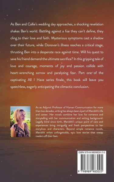 As Ben and Callie's wedding day approaches, a shocking revelation shakes Ben's world. Battling against a foe they can't define, they cling to their love and faith. Mysterious symptoms cast a shadow over their future, while Donovan's illness reaches a critical stage, thrusting Ben into a desperate race against time. Will his quest to save his friend demand the ultimate sacrifice? In this gripping tale of love and courage, moments of joy and passion collide with heart-wrenching sorrow and paralyzing fear. Part one of the captivating All I Have Series finale, this book will leave you speechless, eagerly anticipating the climactic conclusion.