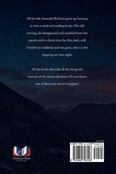 All her life Amanda McGuire grew up learning to love to read and reading books. One fall evening, she disappeared and vanished from her parents with a shriek into the thin, dark, cold October air suddenly and was gone, silent as the lingering air that night! All the books she read, all the things she learned, all the stories she knew. No one knew, one of them was about to happen!