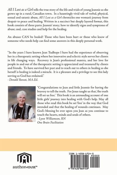 You will not be able to put this book down as you read the true story of author Jean Tudhope's verbal, physical, sexual and satanic abuse. Growing up on a farm with two brothers, Jeannie tells of the heart wrenching experiences that she endured as her own father and brother continually abused her. Her near death experiences with satanic and ritual abuse are difficult to read and a wake up call for the world to look closer at the secret horrors done to our children. Author Jean Tudhope lives on a farm with her husband and several Border Collie dogs. She counsels at her Haven of Rest Counseling offices that are located in her home. She counsels for many problems but deals predominantly with sexual and Satanic abuse. She holds a BA and MA in Christian Counseling and is licensed with the National Christian Counselors Academy in Florida, USA. She also has ARCT and RMT degrees in Piano through the Royal Conservatory of Music in Canada. Each year, Jean hosts a conference focused on healing. The Courage to Heal Conference features one-day seminars on various topics such as depression, anger, fear and terror, sadness, loss, insecurity and more. Some of Jean's work also includes marriage and family counseling and children's counseling. When Jean is not counseling, she is taking care of her purebred Border Collies and their pups or helping out around the farm.
