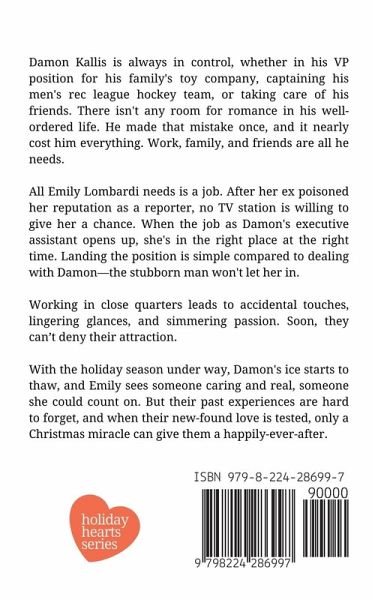 Damon Kallis is always in control, whether in his VP position for his family's toy company, captaining his men's rec league hockey team, or taking care of his friends. There isn't any room for romance in his well-ordered life. He made that mistake once, and it nearly cost him everything. Work, family, and friends are all he needs. All Emily Lombardi needs is a job. After her ex poisoned her reputation as a reporter and left her last boss questioning her integrity, no TV station is willing to give her a chance. When the job as Damon's executive assistant opens up, she's in the right place at the right time. Landing the position is simple compared to dealing with Damon-the stubborn man won't let her in. Working in close quarters leads to accidental touches, lingering glances, and simmering passion. Soon, they can't deny their attraction. With the holiday season under way, Damon's ice starts to thaw and Emily sees someone caring and real, someone she could count on. But their past experiences are hard to forget, and when their new-found love is tested, only a Christmas miracle can give them a happily-ever-after.