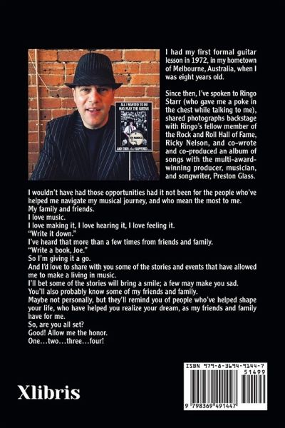 I had my first formal guitar lesson in 1972, in my hometown of Melbourne, Australia, when I was eight years old. Since then, I've spoken to Ringo Starr (who gave me a poke in the chest while talking to me), shared photographs backstage with Ringo's fellow member of the Rock and Roll Hall of Fame, Ricky Nelson, and co-wrote and co-produced an album of songs with the multi-award-winning producer, musician, and songwriter, Preston Glass. I wouldn't have had those opportunities had it not been for the people who've helped me navigate my musical journey, and who mean the most to me. My family and friends. I love music. I love making it, I love hearing it, I love feeling it. "Write it down." I've heard that more than a few times from friends and family. "Write a book, Joe." So I'm giving it a go. And I'd love to share with you some of the stories and events that have allowed me to make a living in music. I'll bet some of the stories will bring a smile; a few may make you sad. You'll also probably know some of my friends and family. Maybe not personally, but they'll remind you of people who've helped shape your life, who have helped you realize your dream, as my friends and family have for me. So, are you all set? Good! Allow me the honor. One...two...three...four!