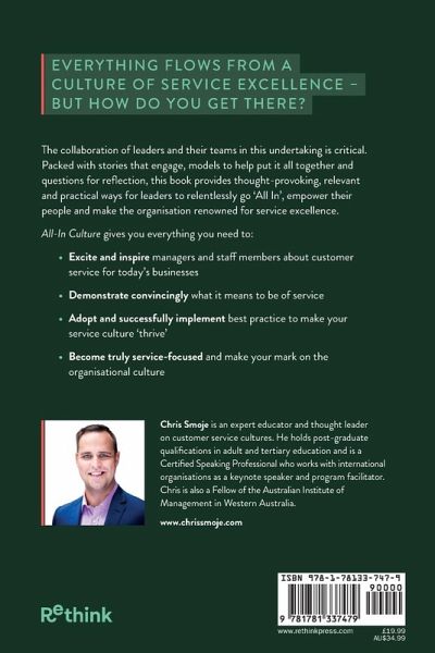 EVERYTHING FLOWS FROM A CULTURE OF SERVICE EXCELLENCE BUT HOW DO YOU GET THERE? The collaboration of leaders and their teams in this undertaking is critical. Packed with stories that engage, models to help put it all together and questions for reflection, this book provides thought-provoking, relevant and practical ways for leaders to relentlessly go 'All In', empower their people and make the organisation renowned for service excellence. All-In Culture gives you everything you need to: ¿ Excite and inspire managers and staff members about customer service for today's businesses ¿ Demonstrate convincingly what it means to be of service ¿ Adopt and successfully implement best practice to make your service culture 'thrive' ¿ Become truly service-focused and make your mark on the organisational culture