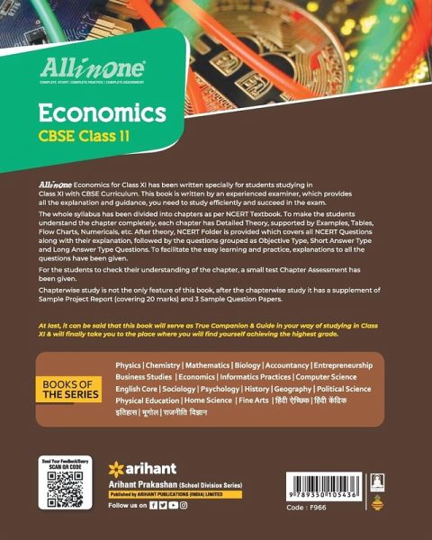 BOOK STRUCTURE 1. Complete syllabus coverage in 2 major parts 2. Project work 3. Sample Question Papers (1-3) BOOK FEATURES 1. Formulated as per the Rationalised NCERT & Latest CBSE Syllabus 2023-24 2. Complete theory in each chapter 3. Check Points for a smooth part-by-part understanding of each chapter 4. Exam Practice Section contains Exam Pattern Questions 5. NCERT Folder includes solutions of all the NCERT Solutions 6. Unsolved Exercises having Exam Pattern Questions for Self-Assessment 7. Solved Examples in between theories to easily explain the application of concepts 8. Sample Question Papers prepared exactly on the latest syllabus & pattern of examination 9. Project work provided at the end of the book WHY THIS BOOK? 1. Fully revised for class 11th and CBSE Exams 2024 2. Complete Study: Well-explained theories in each chapter 3. Complete Practice: Exam Practice and Unsolved Exercise 4. Complete Assessment: Sample Questions Paper for rigorous practice 5. The study material is in a clear & concise form 6. The book ensures complete preparation and practice to succeed in the exam TABLE OF CONTENT: PART A: Statistics for Economics- Introduction to Economics and Statistics, Collection of Data, Organisation of Data, Presentation of Data, Measures of Central Tendency: Arithmetic Mean, Measures of Central Tendency: Median and Mode, Measures of Correlation, Index Numbers, PART B: Introductory Microeconomics- Economics, Economy and its central problems, Consumers' Equilibrium, Demand and Price Elasticity of Demand, Production Function, Concept of Cost, Concept of Revenue, Producer's Equilibrium, Supply and Price Elasticity of Supply, Forms of Market and Price Determination, Project Work, 3 Sample Question Papers