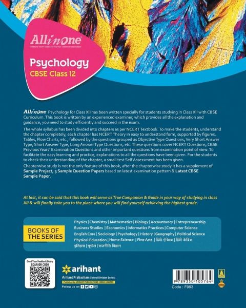 BOOK STRUCTURE 1. Complete syllabus coverage in 7 chapters 2. Sample Practical File 3. CBSE Solved Paper 2023 4. Latest CBSE Sample Paper 5. Sample Question Papers (1-3) BOOK FEATURES 1. Formulated as per the Rationalised NCERT & Latest CBSE Syllabus 2023-24 2. Complete theory in each chapter 3. Check Points for a smooth part-by-part understanding of each chapter 4. NCERT Folder includes solutions of all the NCERT Solutions 5. Chapter Practice Exercise Section contains Exam Pattern Questions 6. Unsolved Exercises having Exam Pattern Questions for Self-Assessment 7. CBSE Solved Paper 2023 to analyze the Exam Pattern 8. Latest CBSE Sample Paper & Sample Question Papers prepared exactly on the latest syllabus & pattern of examination WHY THIS BOOK? 1. Fully revised for class 12th and CBSE Exams 2024 2. Complete Study: Well-explained theories in each chapter 3. Complete Practice: Chapter practice exercise, Unsolved Exercise, latest CBSE Sample Paper, and Sample Practical File 4. Complete Assessment: Sample Questions Paper for rigorous practice 5. The study material is in a clear & concise form 6. The book ensures complete preparation and practice to succeed in the exam TABLE OF CONTENT: Variations In Psychological Attributes, Self and Personality, Meeting Life Challenges, Psychological Disorders, Therapeutic Approaches, Attitude and Social Cognition, Social Influence and Group Processes, Sample Practical File, CBSE Solved Paper 2023, Latest CBSE Sample Paper, Sample Question papers (1-3)
