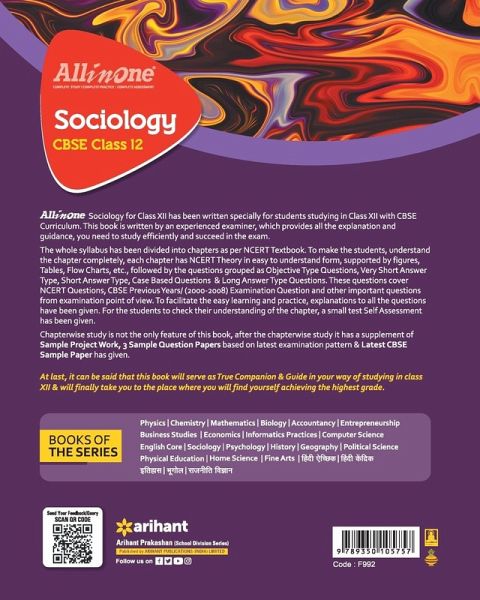 BOOK STRUCTURE Complete syllabus coverage in 2 major Parts Project Work CBSE Examination Paper 2023 Latest CBSE sample paper Sample Question Papers BOOK FEATURES Formulated as per the Rationalised NCERT & Latest CBSE Syllabus 2023-24 Complete theory in each chapter NCERT Folder includes solutions of all the NCERT Solutions Check Points for a smooth part-by-part understanding of each chapter Chapter Practice Section contains Exam Pattern Questions Unsolved Exercises having Exam Pattern Questions for Self-Assessment CBSE Examination Paper 2023 to analyze the Exam Pattern The latest CBSE sample paper and Sample Question Papers prepared exactly on the latest syllabus & pattern of examination WHY THIS BOOK? Fully revised for class 12th and CBSE Exams 2024 Complete Study: Well-explained theories in each chapter Complete Practice: Chapter practice exercise and Unsolved Exercise Complete Assessment: Sample Questions Papers for rigorous practice The study material is in a clear & concise form The book ensures complete preparation and practice to succeed in the exam TABLE OF CONTENT: PART A: INDIAN SOCIETY- Introducing Indian Society, The Demographic Structure of the Indian Society, Social Institutions: Continuity and Change, Patterns of Social Inequality and Exclusion, The challenges of Cultural Diversity, PART B: CHANGE AND DEVELOPMENT IN INDIAN SOCIETY- Structural Change, Cultural Change, Change and Development in Rural Society, Change and Development in Industrial Society, Social Movements, Project Work, CBSE Examination Paper 2023, Latest CBSE Sample Paper, Sample Questions Papers