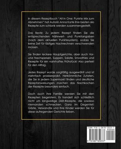 In diesem Rezeptbuch "All In One: Punkte Mix zum Abnehmen" hat die Bestseller-Autorin Anna Korte ihre besten aio Rezepte zum schlank werden zusammengestellt. Das Beste: Zu jedem Rezept finden Sie die entsprechenden Nährwert- und Punktangaben (nach dem aktuellen Punktesystem), sodass Sie keine Zeit für lästiges Nachrechnen verschwenden müssen. Sie finden leckere Hauptgerichte, aber auch Vor- und Nachspeisen, Suppen, Salate, Smoothies und Rezepte für ein nahrhaftes Frühstück! Also perfekt für den Alltag. Jedes Rezept wurde sorgfältig ausgewählt und ist mehrfach praxiserprobt. Herkömmliche Zutaten, die Sie in jedem Supermarkt finden und deutliche Rezeptanweisungen machen das Nachkochen der Rezepte besonders einfach. Doch auch ihre Familie werden Sie mit den Rezepten begeistern. Es handelt sich schließlich nicht um langweilige Diät-Rezepte, die sowieso niemanden schmecken. Ganz im Gegenteil: Gäste, Verwandte und Ihre Kinder werden Sie für diese aufregenden Gerichte lieben.